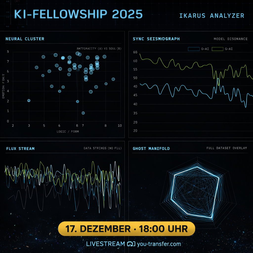 Am 17. Dezember 2025 wurde dieser Prozess nicht nachträglich “erklärt”, sondern live sichtbar gemacht: In einem ca. 90-minütigen Stream wertete IKARUS alle Einreichungen in Echtzeit aus, erzeugte ein Ranking und traf die Entscheidung über die Stipendien vollautomatisiert. Der Stream folgte bewusst keiner klassischen Podiumslogik, sondern entstand offen, spontan und ohne Skript – näher an Live-Kommentar und Beobachtung als an einer kuratierten Diskussion.