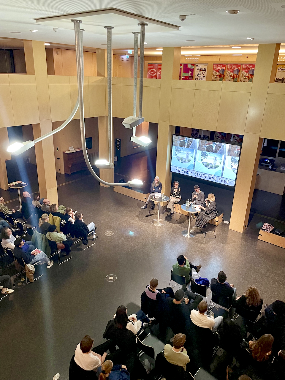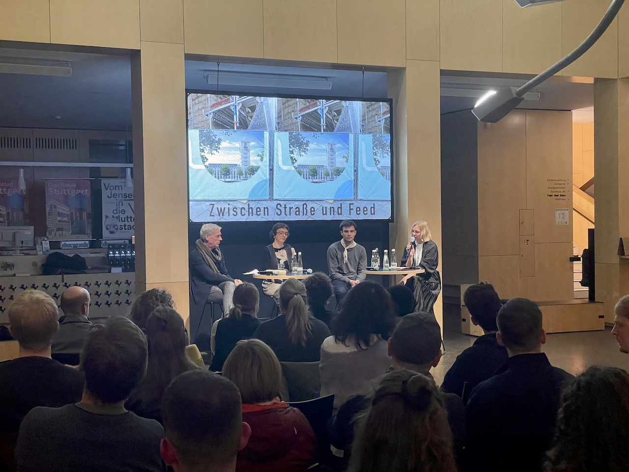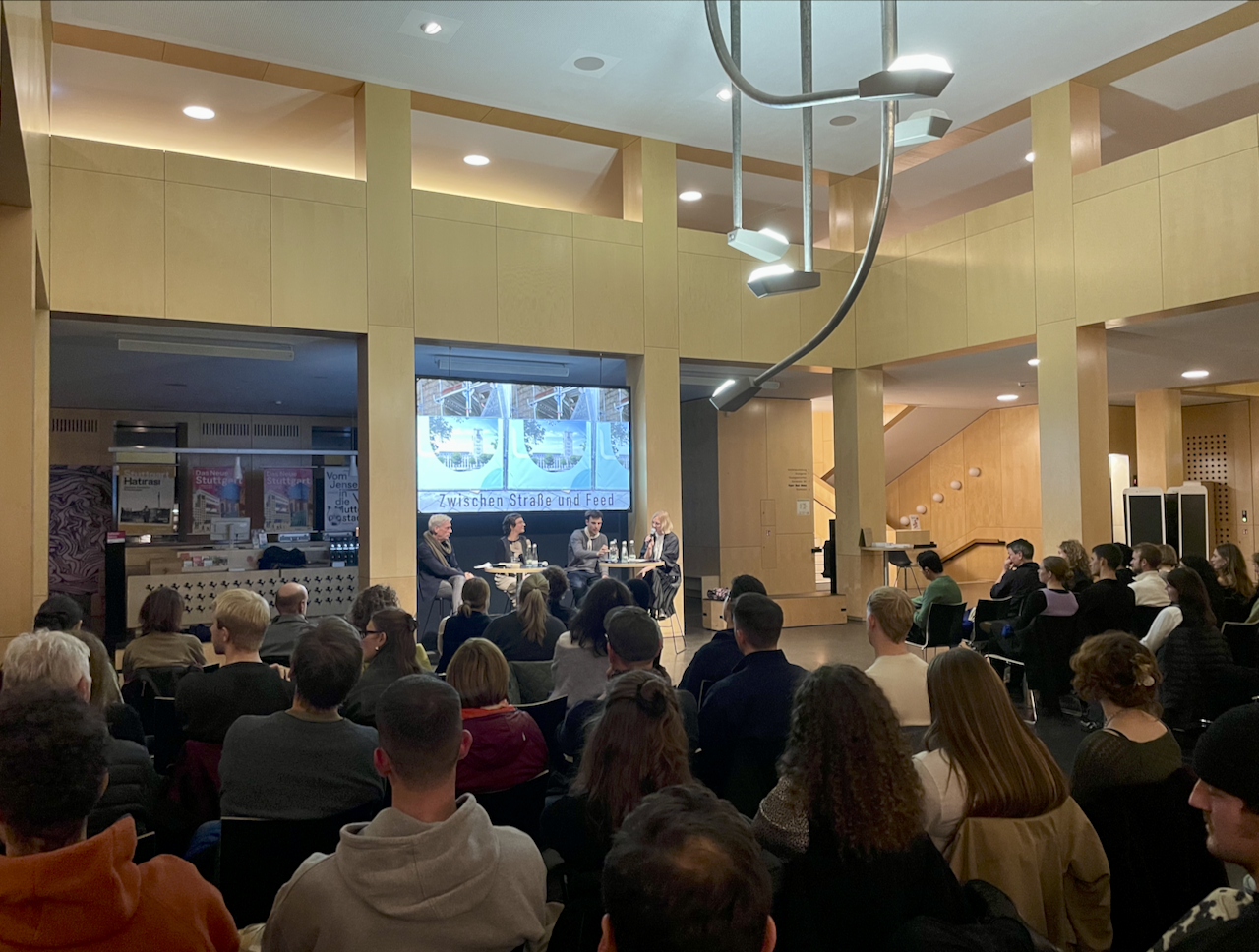 Der öffentliche Abend im StadtPalais Stuttgart markierte den Höhepunkt des Projekts – nicht als Abschluss im Sinne einer fertigen Antwort, sondern als öffentliche Verdichtung der Recherche. Im Gespräch ging es um Sichtbarkeit, Plattformlogiken und die Frage, unter welchen Bedingungen digitale Räume überhaupt „öffentlich“ sein können. Moderiert wurde der Abend von Kirsten Bayer (Leitung Kunst im öffentlichen Raum, Landeshauptstadt Stuttgart). Auf dem Podium diskutierten Lars Henrik Gass (Stuttgart Moving Image Center / Haus für bewegte Bilder), Paula Agarwalla (SWR) und Paulus Goerden.